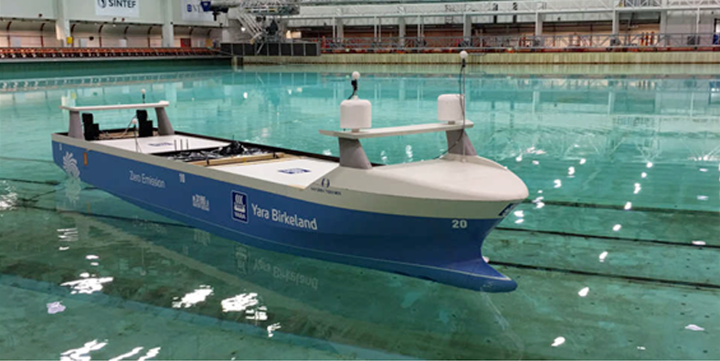 그림1) 노르웨이 Konsberg 사에서 개발 중인 100TEU 무인화물선 YARA 의 모형시험 모습