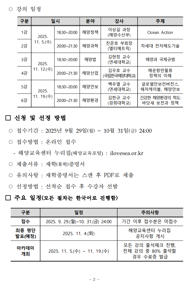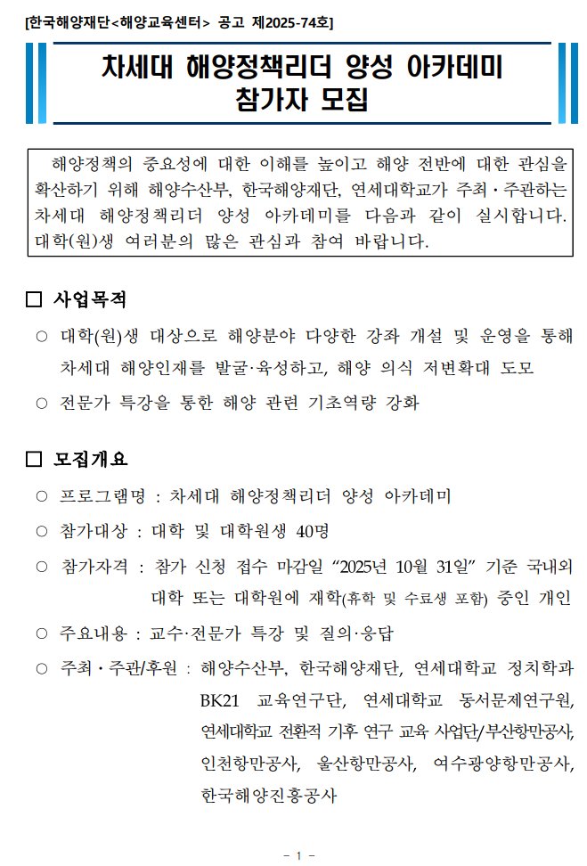 2025년 차세대 해양정책리더 양성 아카데미 참가자 모집(~10. 31. 24:00까지)